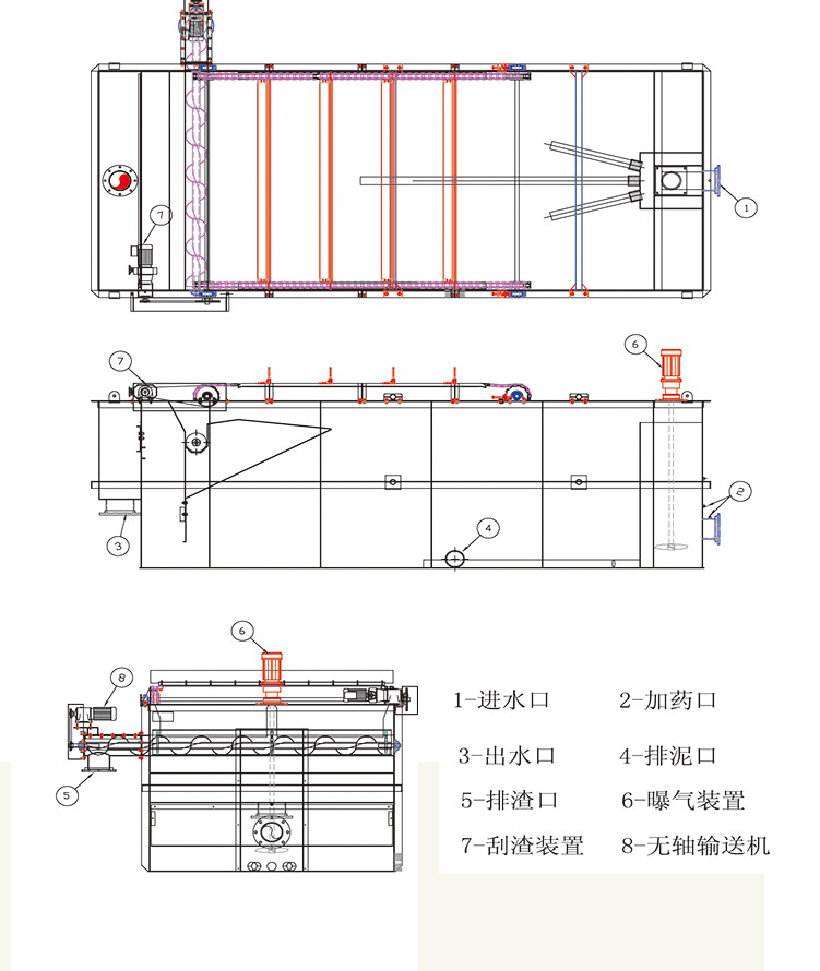 首先原水進(jìn)入氣浮機(jī)混合反應(yīng)器,在混合反應(yīng)器中加入藥劑(除油劑或混凝劑),以形成可分離的絮凝物;當(dāng)經(jīng)預(yù)處理后的污水進(jìn)入氣浮裝置,在進(jìn)水室污水和氣水混合物中釋放的微小氣泡(氣泡直徑范圍30~50um)混合。這些微小氣泡粘附在污水中的絮體上,形成比重小于水的氣浮體。氣浮體上升至水面凝聚成浮油(或浮渣),通過(guò)刮油(渣)機(jī)刮至收油(渣)槽;然后在進(jìn)水室較重的固體顆粒在此沉淀,通過(guò)排砂閥排出,系統(tǒng)要求定期開(kāi)啟排砂閥以保持進(jìn)水室清潔;