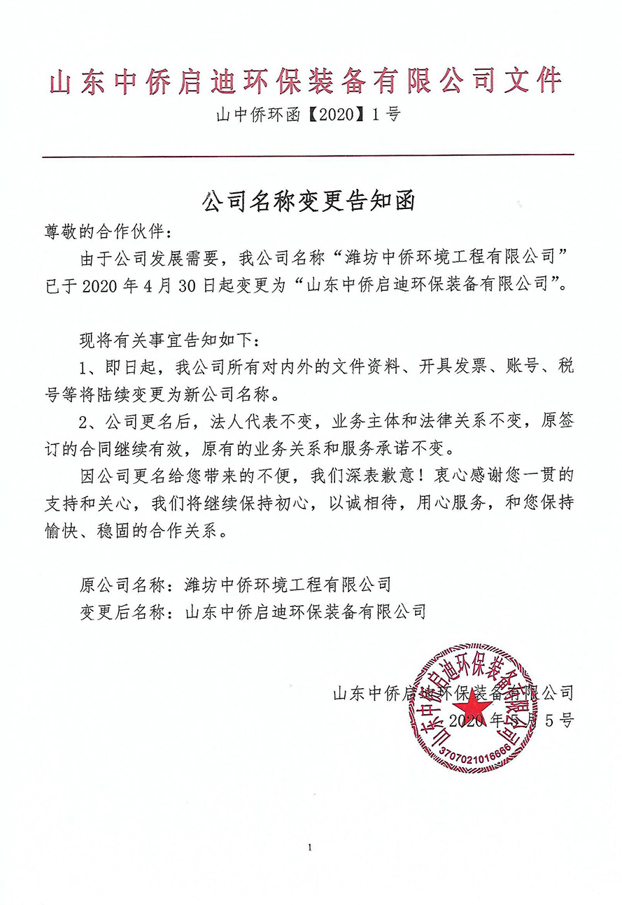 公告:一體化污水處理設備廠家濰坊中僑環(huán)境工程有限公司正式更名為山東中僑啟迪環(huán)保裝備有限公司