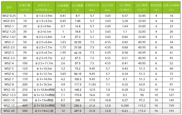 根據(jù)下面的表格和給出的參數(shù) 我們應(yīng)該選擇WSZ-1型號(hào)的QDPP一體化污水處理設(shè)備最為合適,這這個(gè)表格中我們可以詳細(xì)的看到選型設(shè)備的各種參數(shù),我們可以看到一體化污水處理設(shè)備的外形尺寸師直徑為2米,長(zhǎng)度為4.9米的設(shè)備,占地面積為23平米, 根據(jù)這個(gè)尺寸我們可以確定 項(xiàng)目現(xiàn)場(chǎng)占地面積和需要多大的地方就可以安裝這個(gè)設(shè)備,后面的數(shù)據(jù)有重量,根據(jù)這個(gè)稱重量來(lái)做地基的土建建設(shè),還有運(yùn)行功率和后期的運(yùn)行費(fèi)用都可以一目了然。